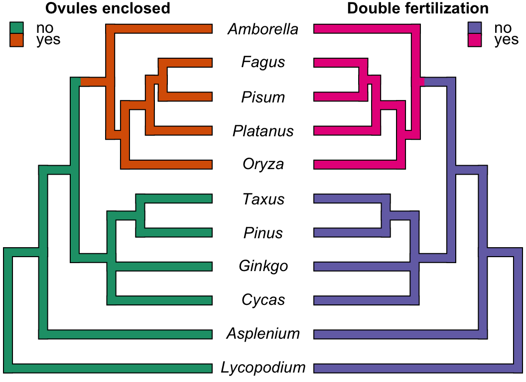 So even if there seems to be replication when we look at the species (several species with each character state was sampled), there is no evolutionary replication! So even if the likelihood that those two events occurred on the same branch is very small and even if a contingency test to calculate the likelihood of such an event is significant, this is a little bit like an experiment with one replicate. Therefore, even when a test that accounts for the phylogeny is significant, a lot of caution is needed when interpreting these results. Ideally, a study should have a decent number of evolutionary replications for the results to be biologically meaningful. I encourage you to read the very nice paper of Maddison and Fitzjohn on the subject (Maddison and FitzJohn 2015).