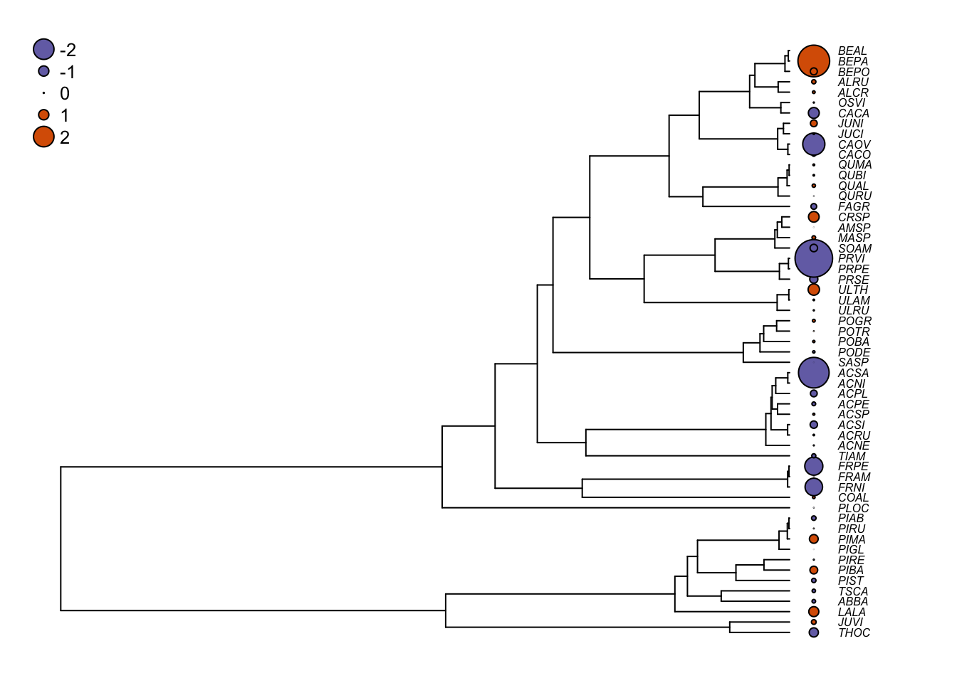 tiplabels(pch=21,bg=cols[ifelse(pgls1.res>0,1,2)],col="black",