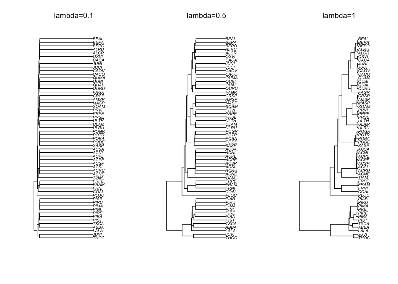 The following figure shows how different lambda values affect the shape of the Quebec trees phylogeny.