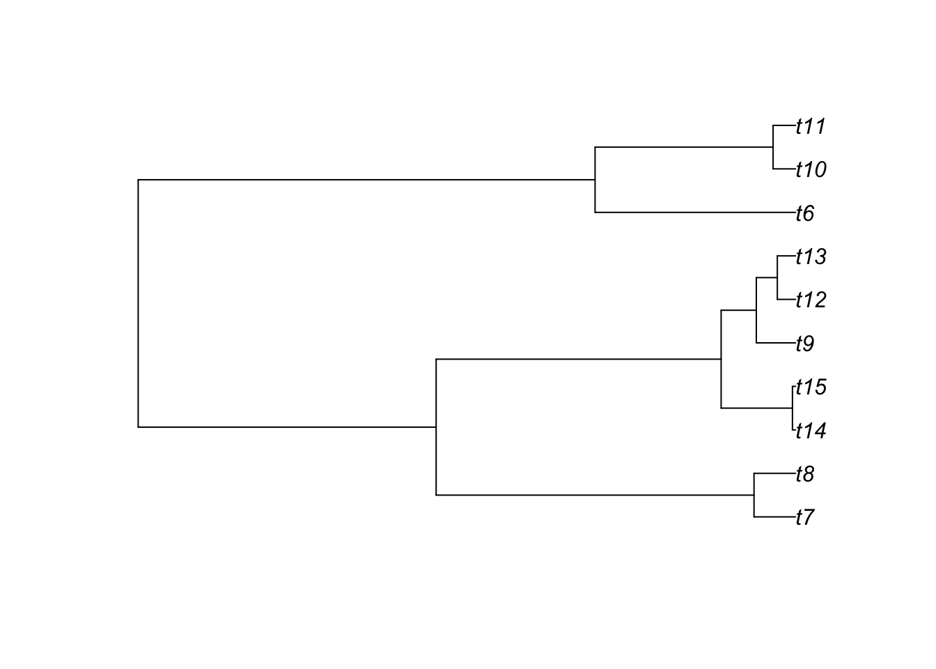 Throughout these exercises, we will often use simulated trees, which are very useful for pedagogical purposes. Trees can be simulated using several functions, but here is an example to simulate one tree with 15 species.